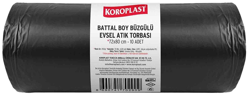 Koroplast Battal Boy Çöp Torbası, 72x80 cm ölçüsü ve 450 gramlık dayanıklı yapısı ile evlerde, restoranlarda ve büyük hacimli atık çıkan alanlarda kullanım için idealdir. Büzgülü ağız yapısı sayesinde çöp kovasına kolayca yerleşir, dolum sonrası güvenli şekilde bağlanabilir.