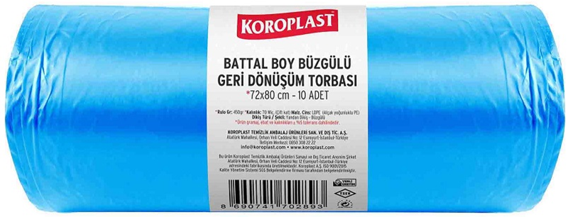 Koroplast battal boy mavi çöp torbası, kağıt ve geri dönüştürülebilir atıkların ayrıştırılmasını kolaylaştırmak amacıyla özel olarak üretilmiştir. Geri dönüşüm yönetmeliklerine uygun renktedir.Büzgülü Ağız Tasarımı ile Kolay Kapama